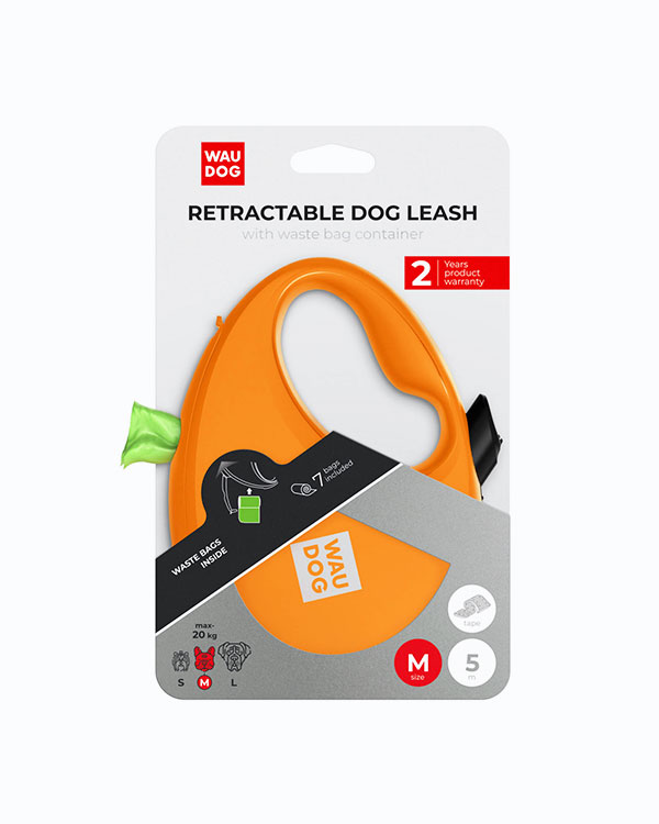 Поводок-рулетка для собак WAUDOG R-leash, с контейнером для пакетов, размер M (до 20 кг), оранжевая