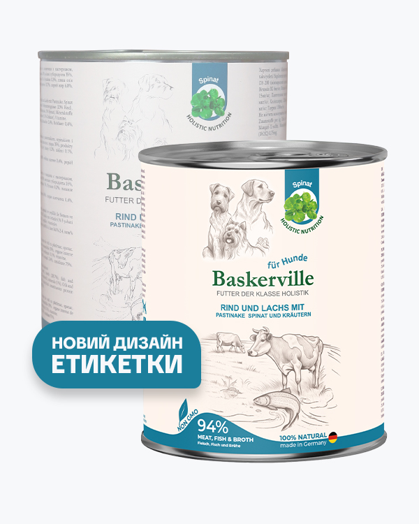 Вологий корм BASKERVILLE на основі м’яса яловичини та риби лосось це смачний, корисний, збалансований і максимально природній раціон, який поєднує якісні інгредієнти без штучних домішок. Корм класу холістик це повноцінне харчування де кожен інгредієнт впливає на здоров’я вашого собаки, оскільки є природним джерелом вітамінів і мінералів. Завдяки споживанню корму BASKERVILLE ваш чотирилапий улюбленець матиме міцний імунітет, здорові суглоби та шкіру і блискучу шерсть. Підходить для собак різного віку – від активних молодих до літніх тварин.