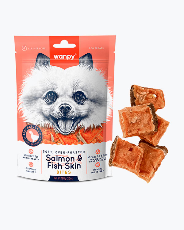 Wanpy Soft Salmon & Fish Skin Bites – натуральні ласощі для собак, приготовані у вигляді невеликих шматочків філе лосося. Призначені як смачне та корисне доповнення до основного раціону дорослих собак і цуценят всіх порід від 3-х місяців. Не містять цукру, солі, зернових, штучних ароматизаторів та барвників, тому можуть використовуватися для собак з харчовою алергією.