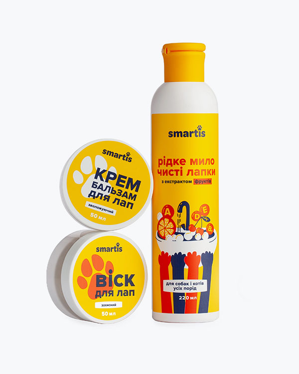 Набір для лап тварин Smartis: віск + крем-бальзам + рідке мило робить повсякденне життя домашніх тварин та їх господарів комфортним та приємним.