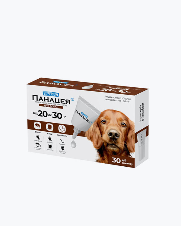Препарат ефективний для лікування та профілактики при ураженні вушним та підшкірними кліщами, блохами та їх личинками, вошами, волосоїдами, гельмінтами (нематодами).