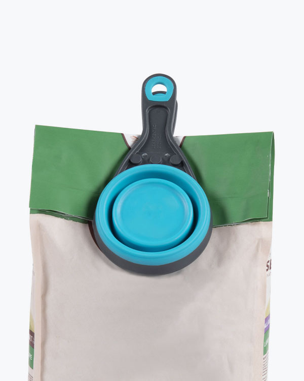 Кліпса, прикріплена до стакана, призначена для закривання мішків з кормом. Завдяки щільному закриттю, яке забезпечує кліпса, корм зберігає свою свіжість і аромат.