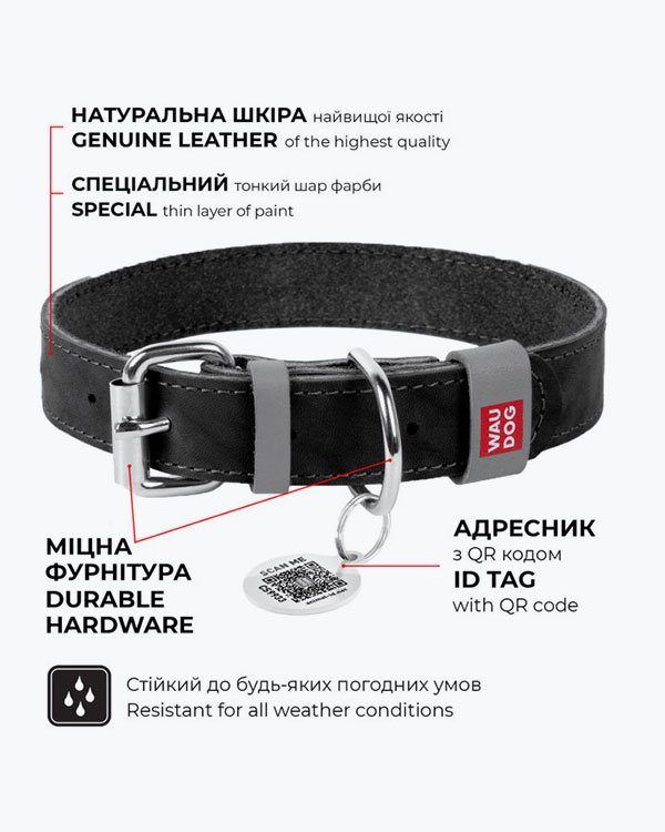 Ошейник WAUDOG Classic кожаный, для собак, черный, XL (46-60 см)