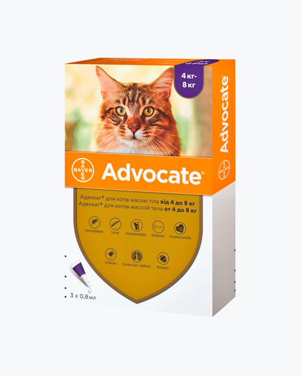Капли Elanco Advocate Адвокат, от блох, клещей и гельминтов, для кошек, весом от 4 до 8 кг, 1 пипетка