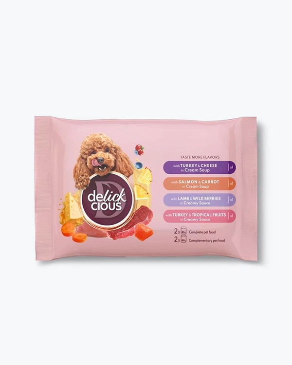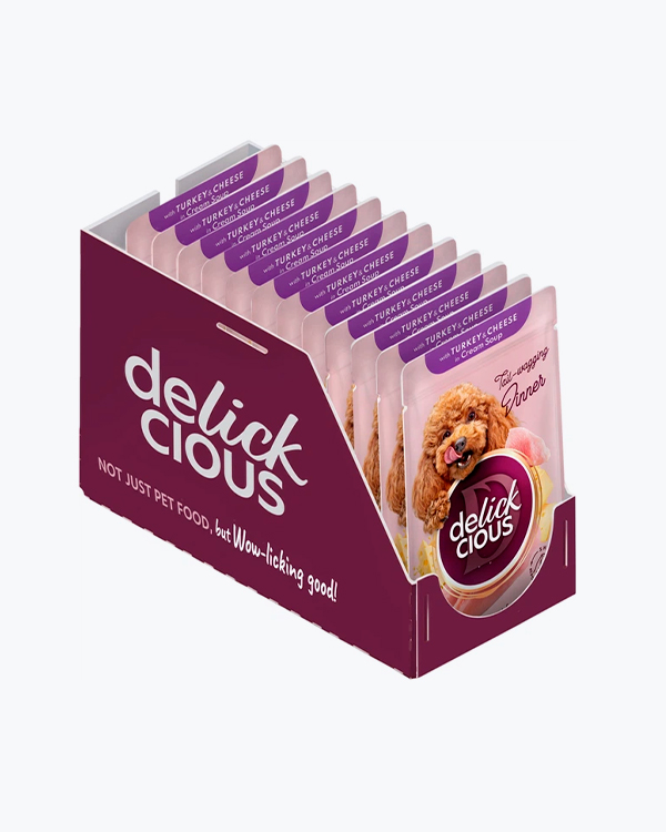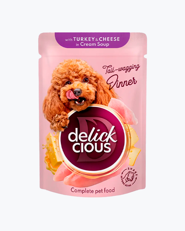Вологий корм для собак Delickcious Turkey & Cheese, смужки з індичкою та сиром в крем-супі, 85 г, пауч