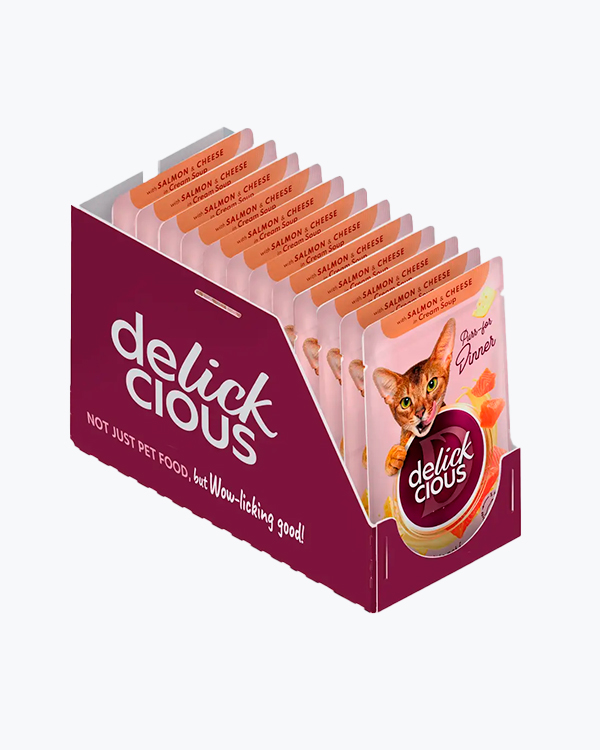 Вологий корм для котів Delickcious with Salmon & Cheese in Cream Soup, смужки з лососем та сиром в крем-супі, 85 г, (12 шт)