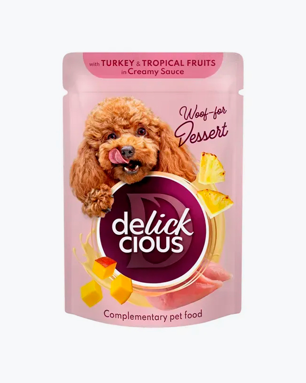 Вологий корм для собак Delickcious with Turkey & Tropical Fruits, пластівці з індичкою та фруктами, 85 г, пауч, 12 шт