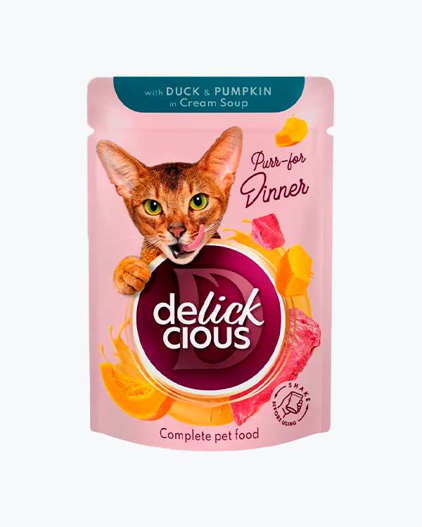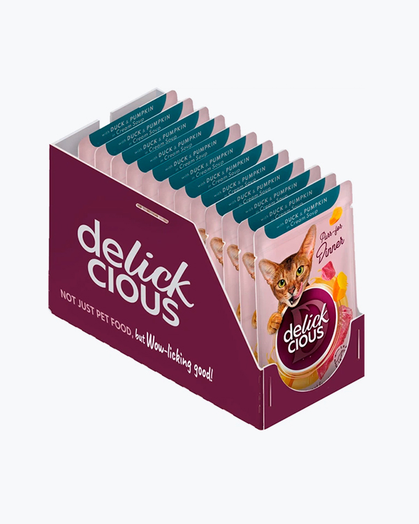 Вологий корм для котів Delickcious with Duck & Pumpkin in Cream Soup, смужки з качкою та гарбузом в крем-супі, 85 г, (12 шт)