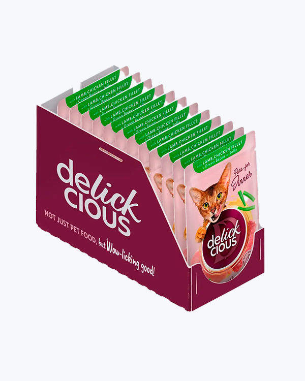 Вологий корм для котів Delickcious with Lamb, Chicken Fillet & Green Beans, з ягнятиною, курячим філе і квасолею, 85 г, пауч