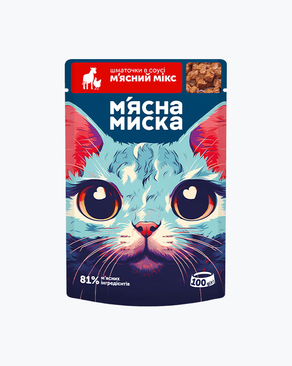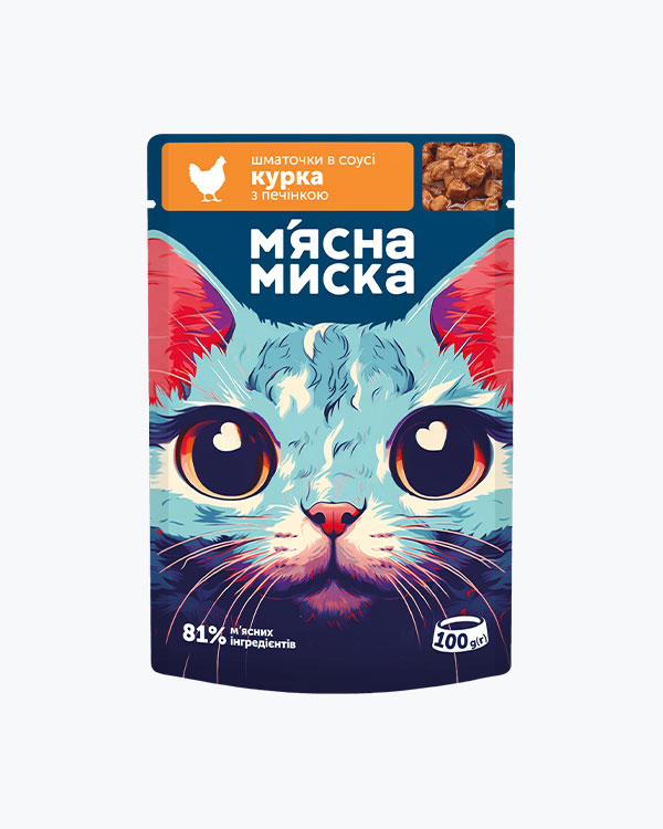 Вологий корм М'ясна Миска для дорослих котів, шматочки в соусі з куркою та печінкою, 100 г