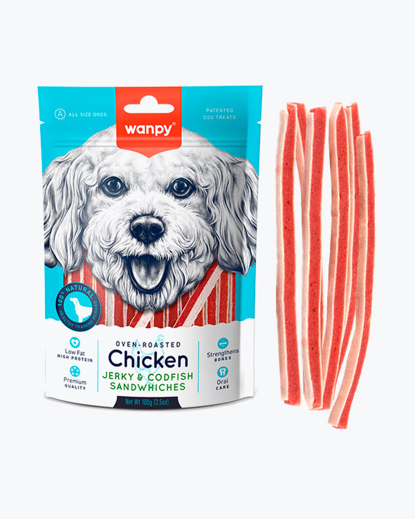 Ласощі WANPY Chicken Jerky & Codfish Sandwiches для собак, сендвіч-смужки з куркою та тріскою, 100 г