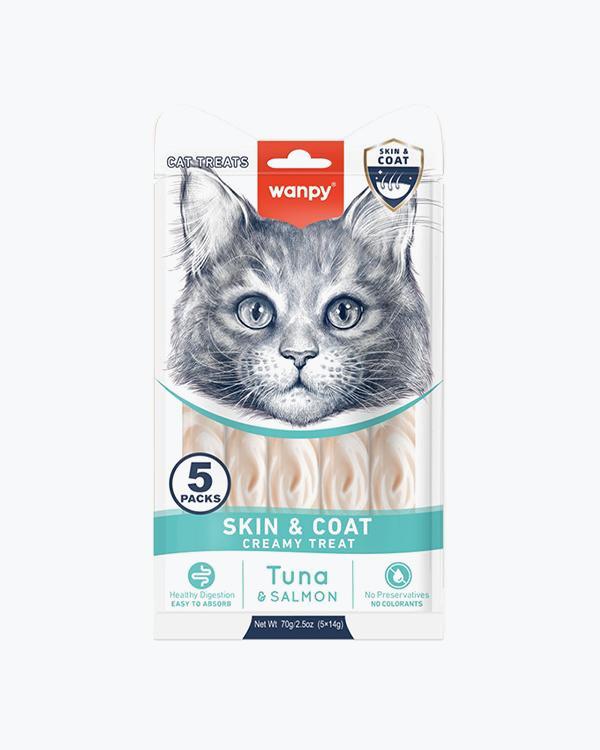 Рідкі ласощі WANPY Functional Creamy Lickable Treat Skin&Coat для котів, здоров'я шкіри та шерсті, з тунецем та лососем, 5 шт по 14 г